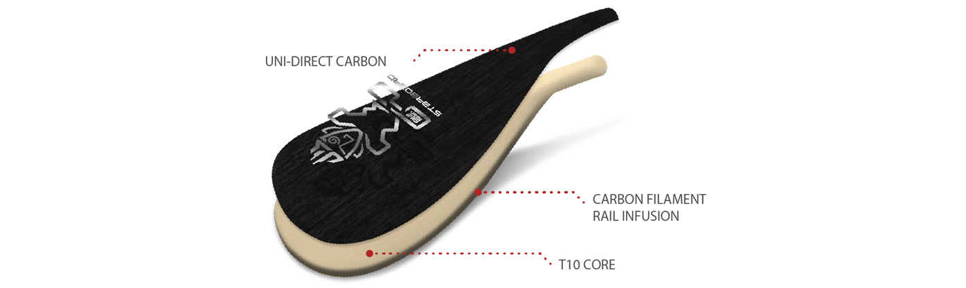 • La totalité de la paggaie est recouverte d’une lamination avec du carbone unidirectionel afin d’apporter de la solidité et du contrôle tout en minimisant le poids.