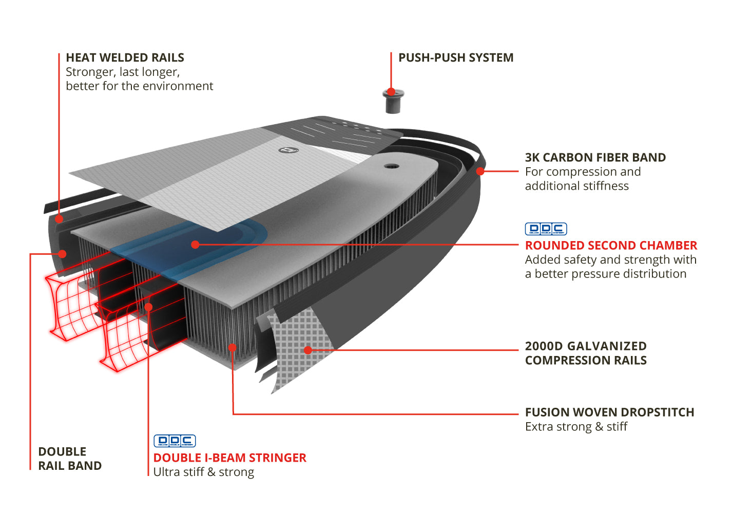 • La technologie Double Chamber ajoute à la sensation qui s'approche de la place rigide. La deuxième chambre à double parois au centre de la planche ajoute aussi à la sécurité advenant un bris en situation d'urgence.