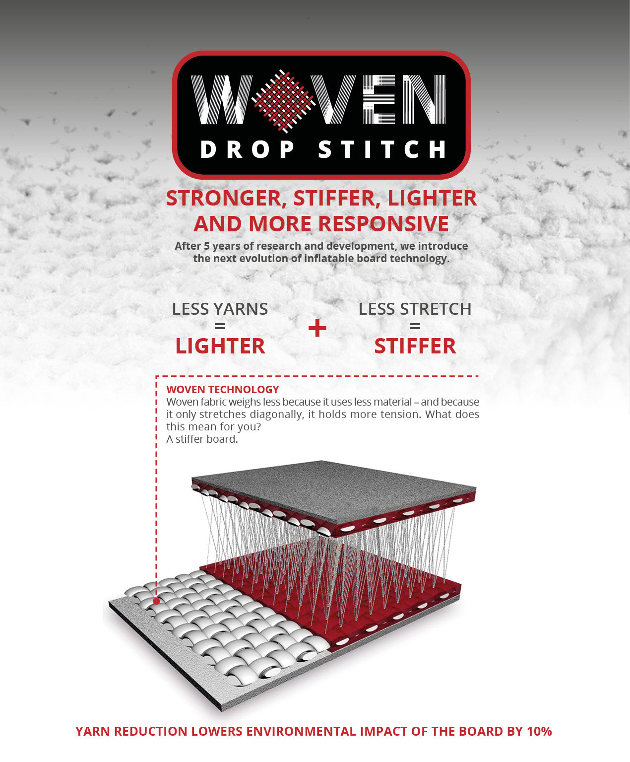 • Le Fusion Woven dropstitch, tramé et fusionné rend les planches en technologie Deluxe super solides et rigides.
